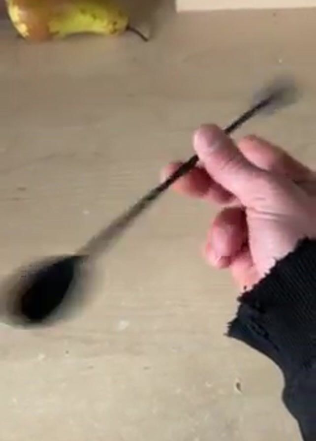 person holding a black, twisted cocktail stirring spoon in their right hand. The person rotates the spoon. A pear and a cardboard box are in the background on a wooden surface. The person is wearing a black sweatshirt with a ripped cuff.