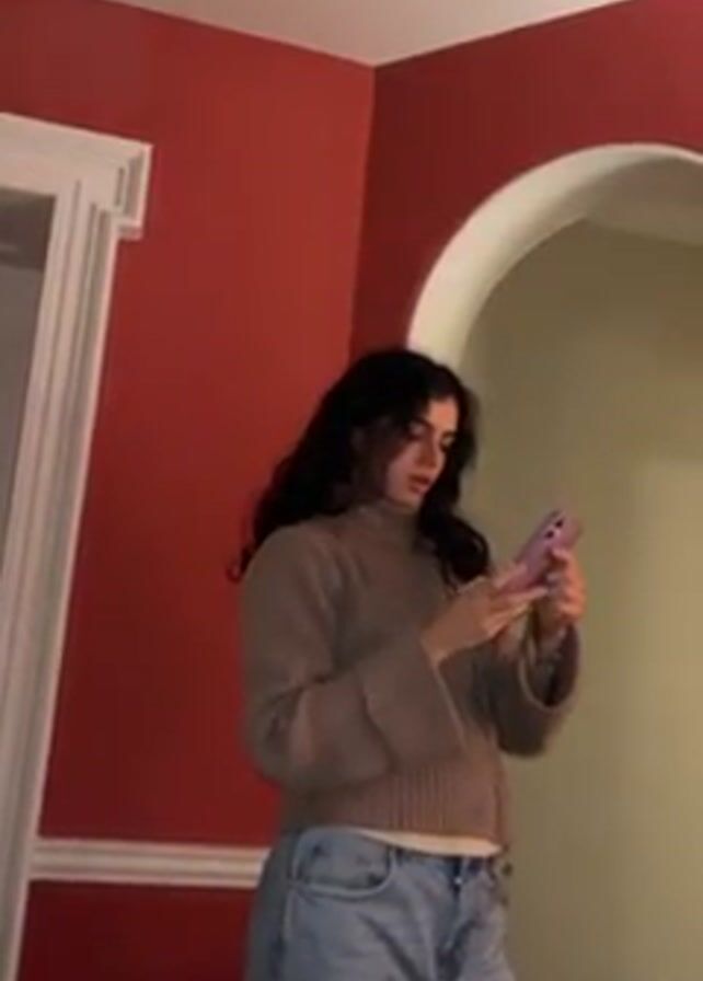 A person stands in a corner between a doorway with red walls and an arched doorway with yellow walls. The person holds a phone, looks at it, and then lifts the phone toward the arched doorway to seemingly take a picture or video of it.