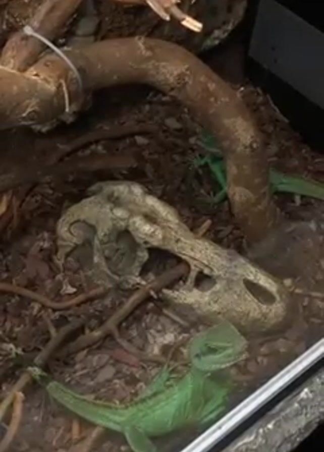 A green lizard is visible in a terrarium. The enclosure contains tree branches, twigs, and a skull-shaped ornament. The lizard is positioned near the front of the terrarium, in front of the skull. There's another lizard in the background, partially obscured by branches.