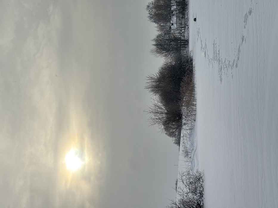 The image depicts a snow-covered winter landscape in Азярэцкі сельскі Савет, Belarus, under an overcast sky with the sun visible in the upper left quadrant. The foreground consists of a vast expanse of undisturbed white snow, with a distinct, winding trail of individual footprints originating from the lower right and extending towards a dark, squat object situated on the snow in the mid-right. This object appears to be a portable shelter, possibly for ice fishing. In the middle ground, a line of bare, deciduous trees and a patch of dried reeds or tall grasses are visible on a low rise or bank behind the snow-covered surface. Further in the background, to the right, several small, modest buildings with snow-covered roofs are partially obscured by trees. The sky is predominantly grey with diffuse cloud cover, through which a bright, luminous sun casts a soft light on the scene. Small specks are visible in the air, consistent with falling snow. No individuals are present in the frame.