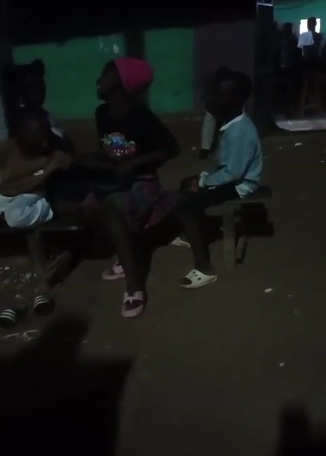 A dimly lit outdoor area has a group of children sitting on wooden benches