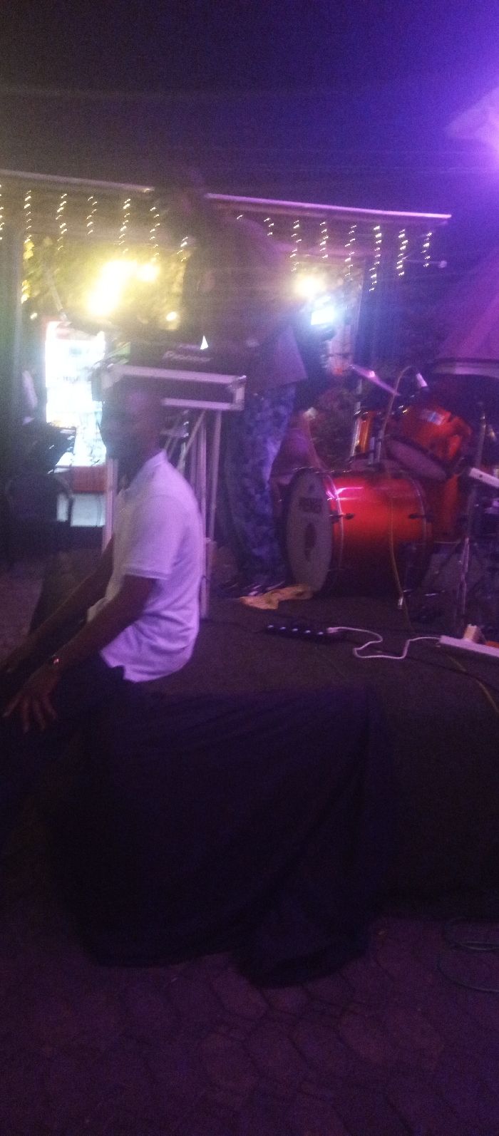 A dimly lit stage features a seated man in a white shirt and dark pants, possibly a musician, with a keyboard visible to his left. A drummer stands behind him, partially obscured, with a red drum set prominently displayed. String lights adorn the background above the performers, and purple and yellow light washes across the scene, creating a lively atmosphere. Cables and equipment clutter the stage floor.
