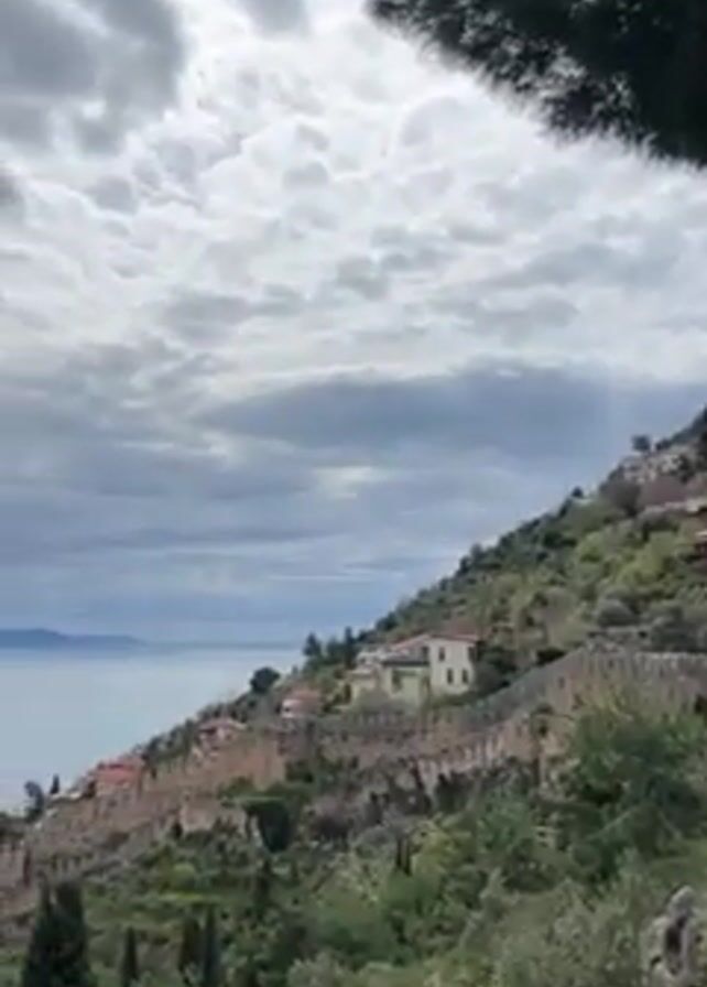 The camera pans from right to left, revealing a picturesque coastal scene. A hillside is covered with vegetation and historic stone structures, including what appears to be a protective wall. A few houses dot the hillside, their roofs a contrasting red color against the greenery. In the distance, a large body of water stretches out to the horizon, meeting the sky which is filled with heavy, overcast clouds. A long, narrow pier extends into the water, anchored by a round, brick structure at its base. The terrain in the foreground is rocky and partially covered with sparse vegetation. A tree branch partially frames the upper right corner of the shot.