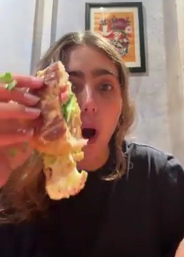 A fair-skinned woman with wavy light brown hair is seated indoors at a restaurant, eating a sandwich. She's wearing a black T-shirt. She holds the sandwich in front of her face, looks at the camera, and then takes a large bite. Her mouth is open wide. Behind her, there's a framed art print on the wall with a dark gray/light blue wall. There are also some white trim pieces around the frame. The woman has rings on her fingers and a black elastic hair tie on her left wrist. The sandwich appears to have lettuce, tomato, and cheese.