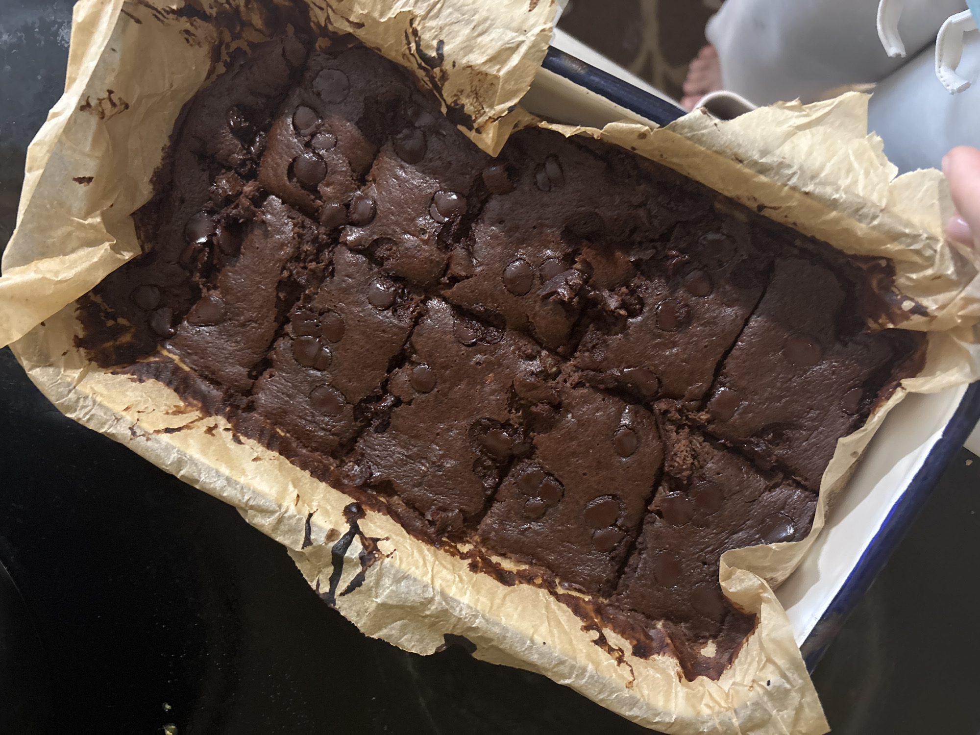- "A rectangular pan of brownies, lined with parchment paper, is situated on a dark surface" by FM-hqpSj2, licensed under CC BY 4.0
