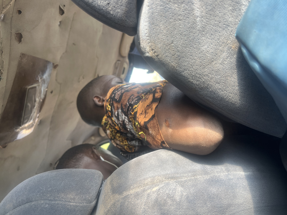 This image displays the interior of a vehicle in Gusau, Nigeria, viewed from a rear passenger's perspective, looking forward