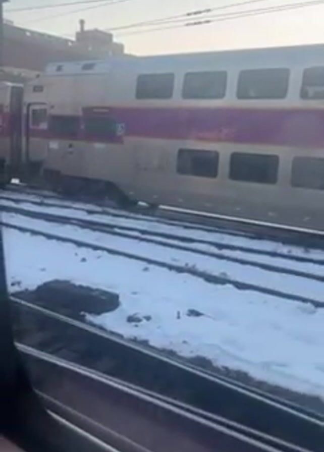 train stopped on snowy tracks next to another train. The train next to the train the video is being recorded from is silver with a purple stripe down the middle. The train has two levels of windows, and some people are visible inside. The train tracks and the ground around them are covered in snow. The sky is bright and clear. Overhead wires and support structures are visible above the trains. A building is visible in the background.