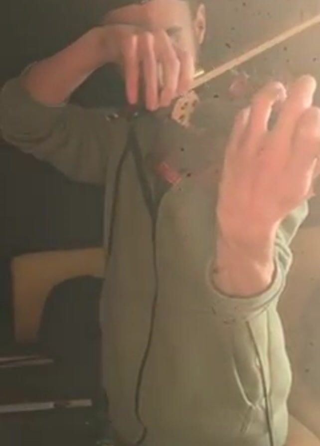 A man in a green hoodie and a black baseball cap plays a red electric violin. He is indoors in a dimly lit room with a black background. A chair and a case are visible in the background.