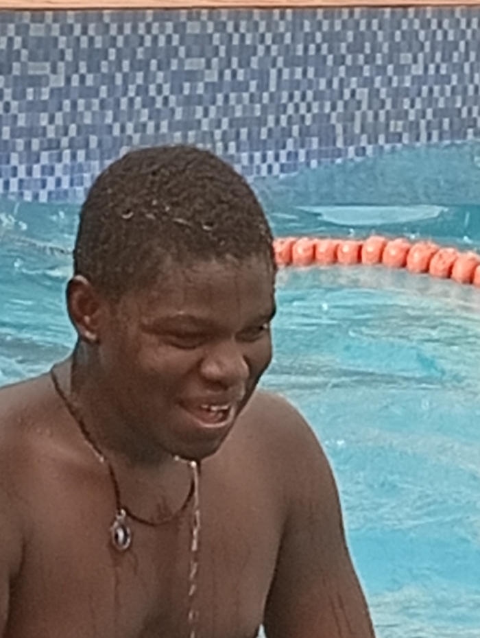 A dark-skinned man is in a swimming pool. He is wearing a necklace with a pendant. Water is dripping from his chin. The pool water is blue, and there is an orange floating barrier in the background. Blue and white tiles decorate the pool's edge in the background. The man has short, dark hair and a happy expression.