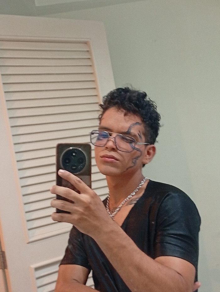 A person with curly black hair, dark eyebrows, and glasses takes a selfie. There are drawn-on markings around their left eye. They wear a black short-sleeved shirt and a silver chain necklace. The phone has a unique triple-lens camera setup. A white door with horizontal slats is behind them, and a light green wall is to the side.