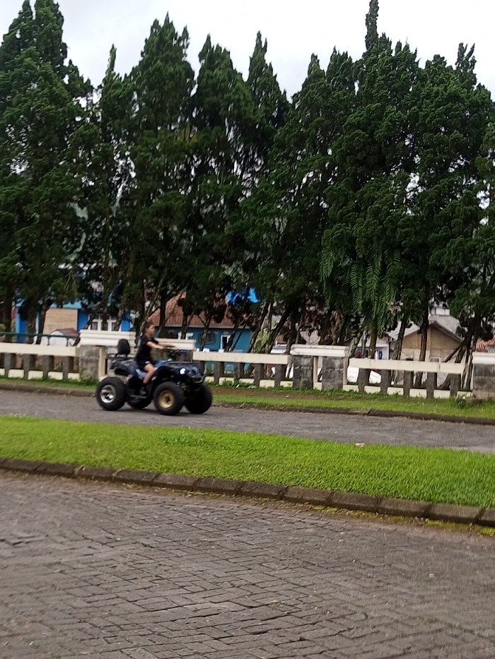 An all-terrain vehicle is moving on an asphalt road with an area of green grass on the left side. The driver is wearing dark clothing. In the background, there is a long fence behind which are tall, dark green trees. There are also some visible buildings with a variety of colors behind the fence and trees. The sky is overcast.
