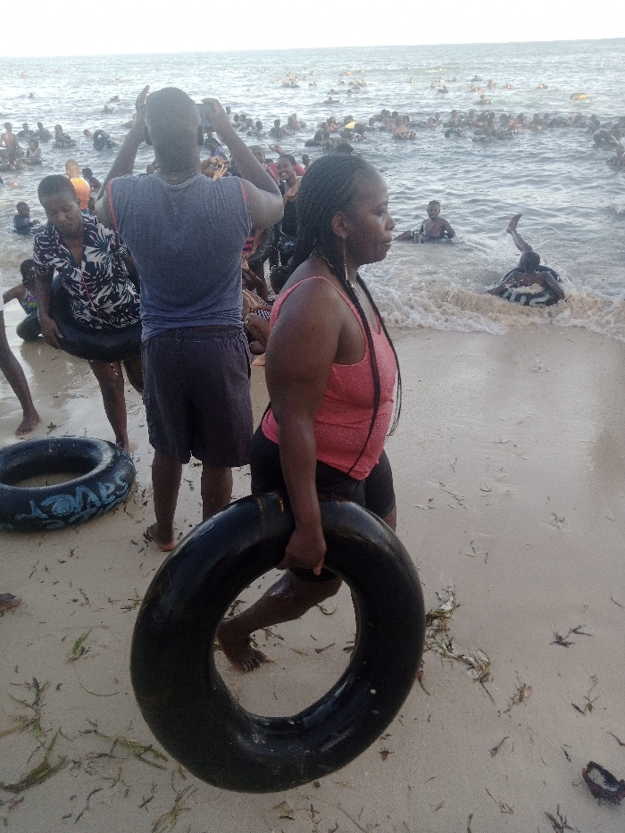 The scene depicts a crowded beach in Shanzu ward, Kenya, with numerous individuals engaged in recreational activities in and along the Indian Ocean. In the foreground, a dark-skinned woman with braided hair, wearing a pink sleeveless top and dark shorts, walks leftward on the wet sand, carrying a large black inner tube in her right hand. Her feet are bare. Behind her, a dark-skinned man with a shaved head, wearing a dark grey sleeveless shirt and dark shorts, stands facing away from the viewer, towards the ocean. His hands are raised near his head, suggesting he is holding an object, possibly a camera or phone, to capture the scene. To his left, another individual in a white and dark patterned short-sleeved shirt and dark bottoms stands in the shallow water, holding a black inner tube around their waist. On the sand to the left, a black inner tube with visible white lettering, possibly "SAVE", is present. The immediate shoreline consists of light-colored sand, wet from the retreating waves, with scattered dark seaweed or debris. The ocean is densely populated with people, many of whom are utilizing black inner tubes for flotation. They are dispersed across a significant area of the water, extending into the background. One person's legs are visible protruding from the water near the shore, suggesting they are partially submerged or upside down on an inner tube. The water surface appears choppy with small waves. The sky is light, suggesting daytime conditions.