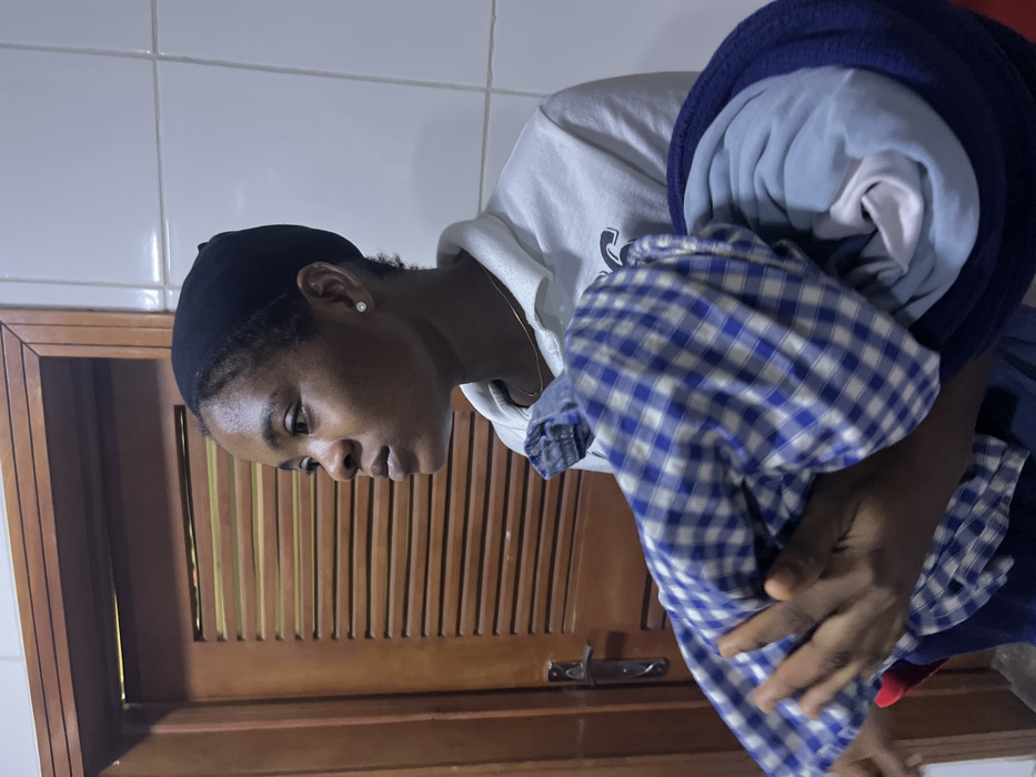 A young woman wearing a black cap and a white sweatshirt is carrying a pile of folded laundry. The laundry includes a blue and white checkered shirt and a blue fleece blanket. She appears to be indoors, with a light wood cabinet or door with vertical slats behind her. The walls are white and possibly tiled. The woman looks downward, focused on her task.