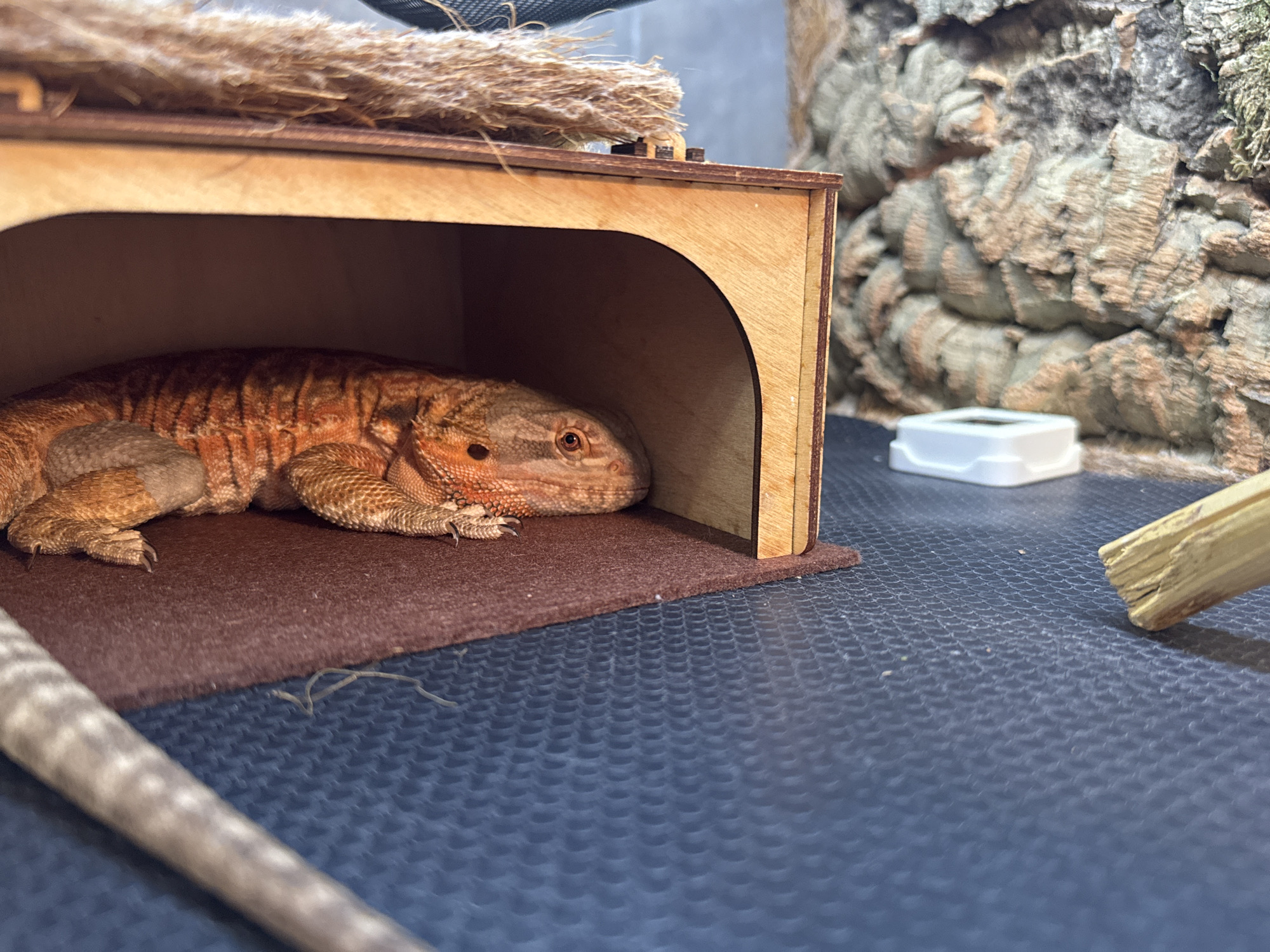 - "An orange and brown bearded dragon is resting inside a wooden enclosure with a brown floor" by FM-GnXsE3, licensed under CC BY 4.0