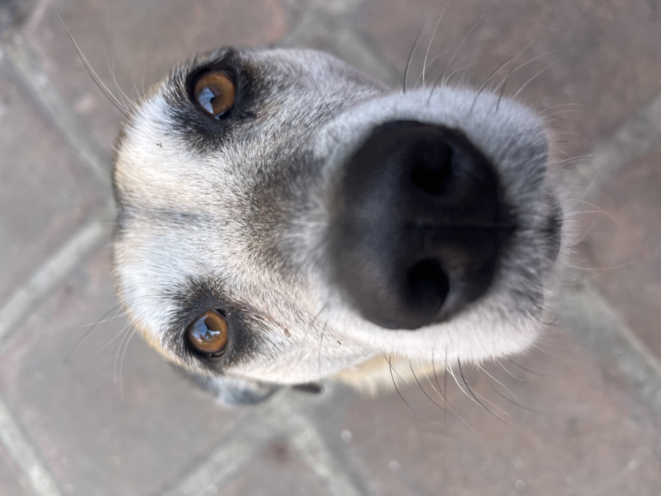 A dog's face fills the frame, shot from a low angle, emphasizing the large, black nose
