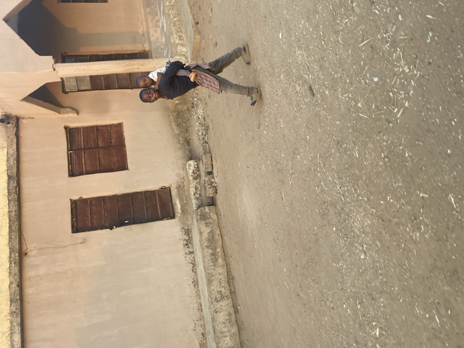 - "A man carries a child on his back outside a tan building with barred windows" by FM-v68Gl1, licensed under CC BY 4.0