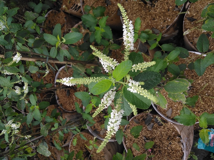 The image displays an overhead perspective of multiple potted plants in what appears to be a nursery or garden environment. The specific location within Maturin, Venezuela, is not discernible from the visual information provided. The foreground is dominated by a thriving plant featuring numerous spikes of small, dense white flowers radiating outward from the central stem, surrounded by dark green, oval-shaped leaves. Numerous other similar plants are arranged closely together in the background and around the main subject. These plants are housed in various containers, including dark nursery pots and lighter-colored, possibly repurposed, plastic containers. The potting medium within these containers consists of dark soil overlaid with a layer of light brown organic material resembling wood chips or rice hulls. A thin, light-colored wooden stake is visible, providing support to one of the plants. In the lower-left corner of the frame, a segment of a blue plastic object, likely a bag, is partially visible, bearing white text with the word "MANGO" identifiable. No individuals or overt actions are depicted in the scene.