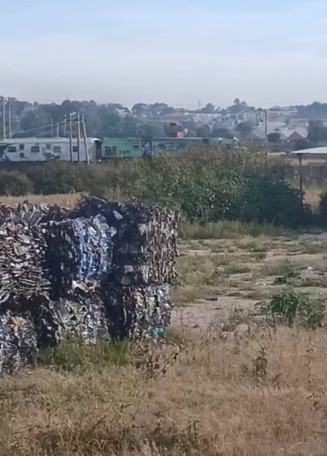 desolate landscape. In the foreground, a large pile of what appears to be compacted garbage sits amidst dry, brown grass. A shed structure stands nearby, with piles of wrapped material underneath its roof. In the background, a train passes along a track. The scene is under a hazy sky with hints of distant buildings. The camera pans slightly to the right, following the movement of the train. A train whistle is audible.