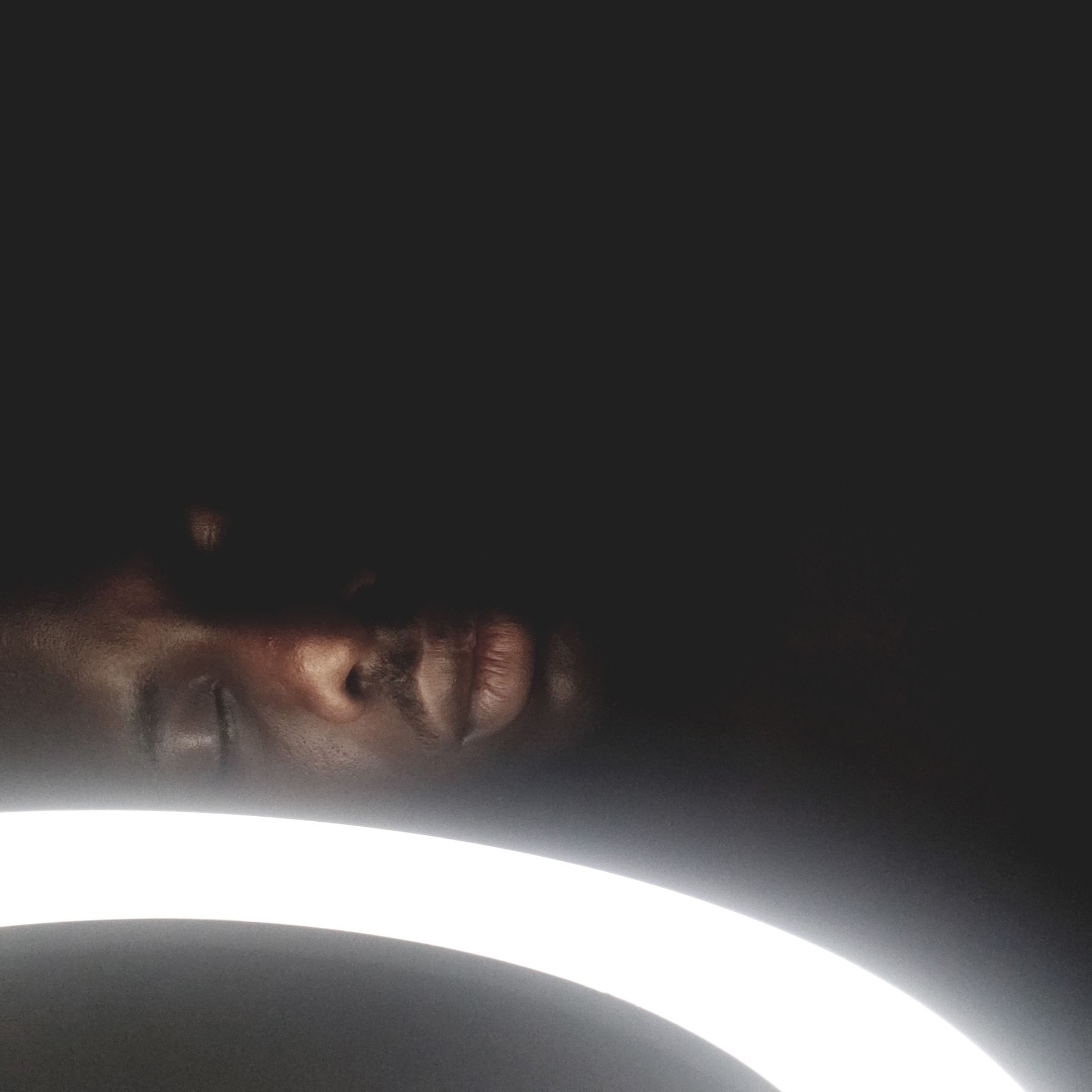 A close-up portrait, presumably taken in Narayi, Nigeria, features an individual with dark skin. The subject's face is bisected vertically by light: the left side is brightly illuminated by a prominent, curved arc of white light, consistent with a ring light, while the right side is predominantly in deep shadow. The individual's eyes are closed. A mustache and a slight goatee are visible on the illuminated left side of the face. The lips are closed. The background is uniformly dark and devoid of features.