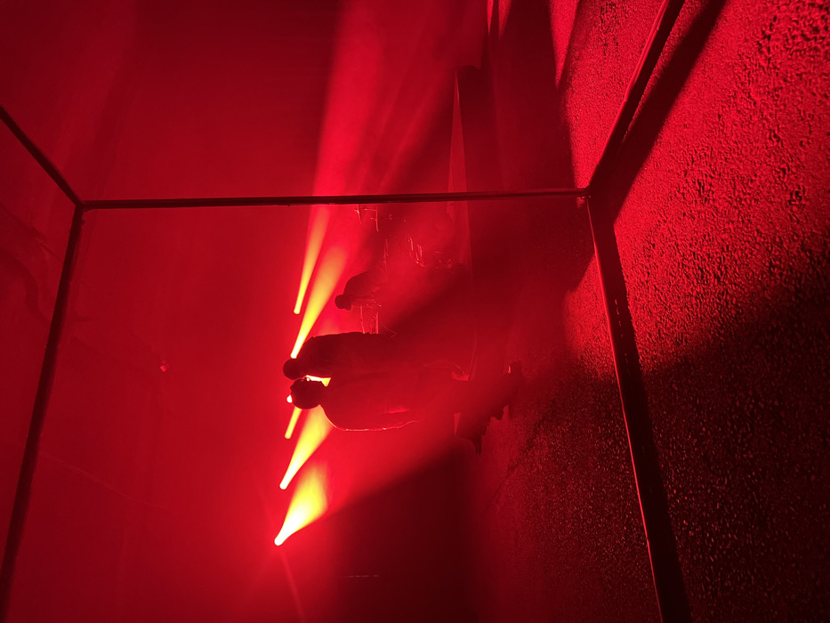 The image displays an indoor or enclosed environment, specifically in Rostov-on-Don, Russia, illuminated predominantly by intense red artificial light. The floor surface is dark and exhibits a granular texture, consistent with asphalt or coarse concrete. Three human figures are visible, rendered as dark silhouettes against the bright red backdrop. Two individuals stand in the mid-ground, positioned slightly left of the image's vertical center. The forward figure faces away from the camera, while the second stands slightly behind and to their right. A third individual is located further back on a discernible raised platform or stage-like structure, appearing to be in a stooped or kneeling posture over an unidentified object. Four distinct, conical beams of yellowish-red light emanate from an unseen source in the background, projecting through a visible atmospheric haze. A dark, open-frame rectangular structure, constructed from metal bars, occupies the foreground, framing the bottom right corner and extending vertically along the right edge of the image.