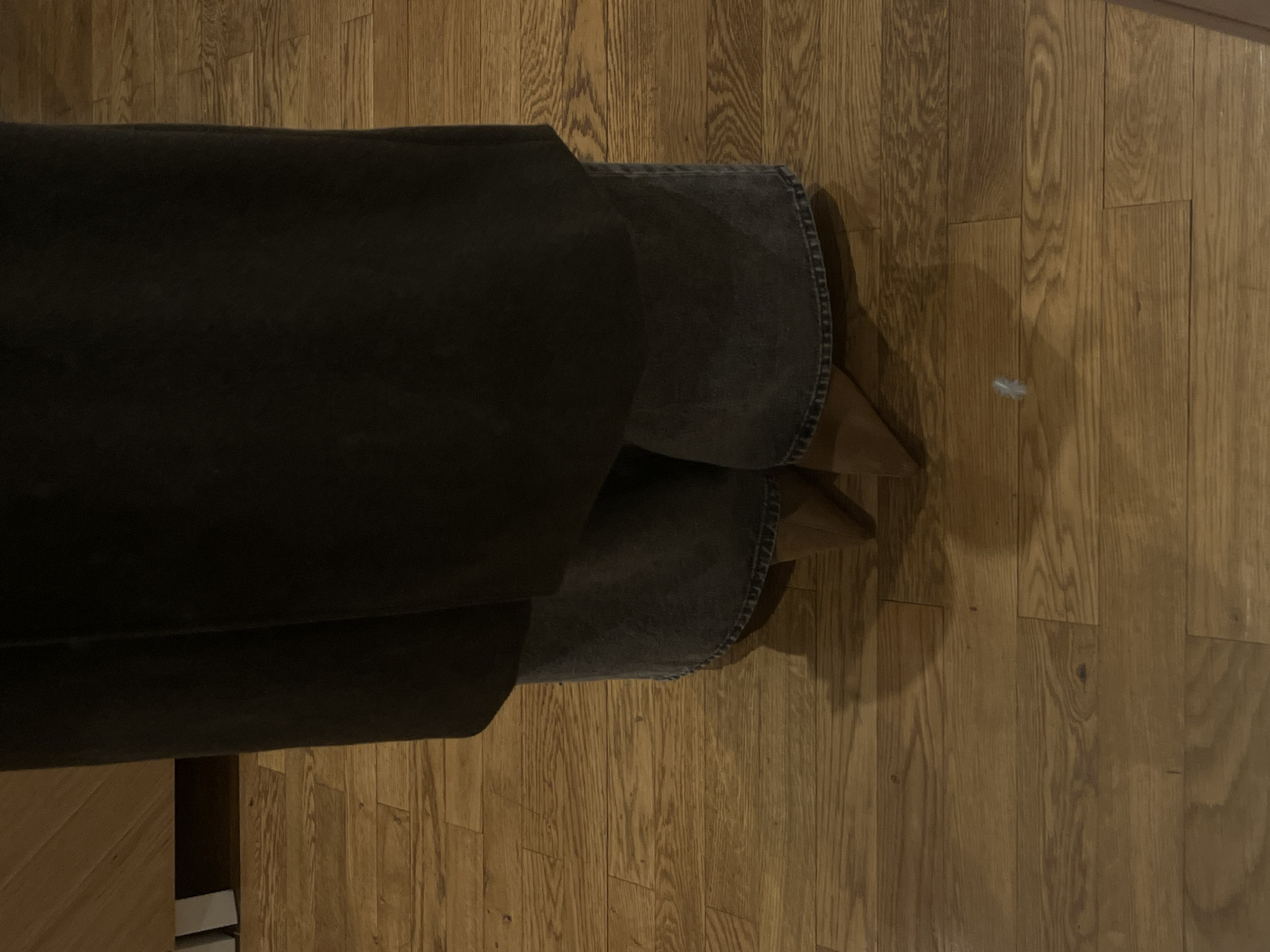 The image displays the lower body of an individual standing indoors on a light brown wooden plank floor. The person is wearing a dark, possibly black, flowing outer garment that obscures the upper legs. Beneath this, dark grey, wide-leg denim trousers with an unstitched or frayed hemline are visible. The individual's feet are clad in tan, pointed-toe high heels. A small, white, fluffy object, consistent with a feather or a piece of lint, is present on the wooden floor in the lower-middle foreground. In the upper left background, the base of a light-colored wooden furniture piece or cabinetry is partially visible, featuring a dark recessed plinth and two white vertical supports. The specific location within the city of Lyon, France, is not discernible from the visual evidence provided in the image.