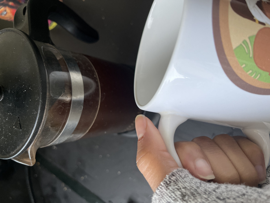 The image captures an indoor scene in Aubervilliers, France, showing a partial view of a French press coffee maker and a hand holding a mug