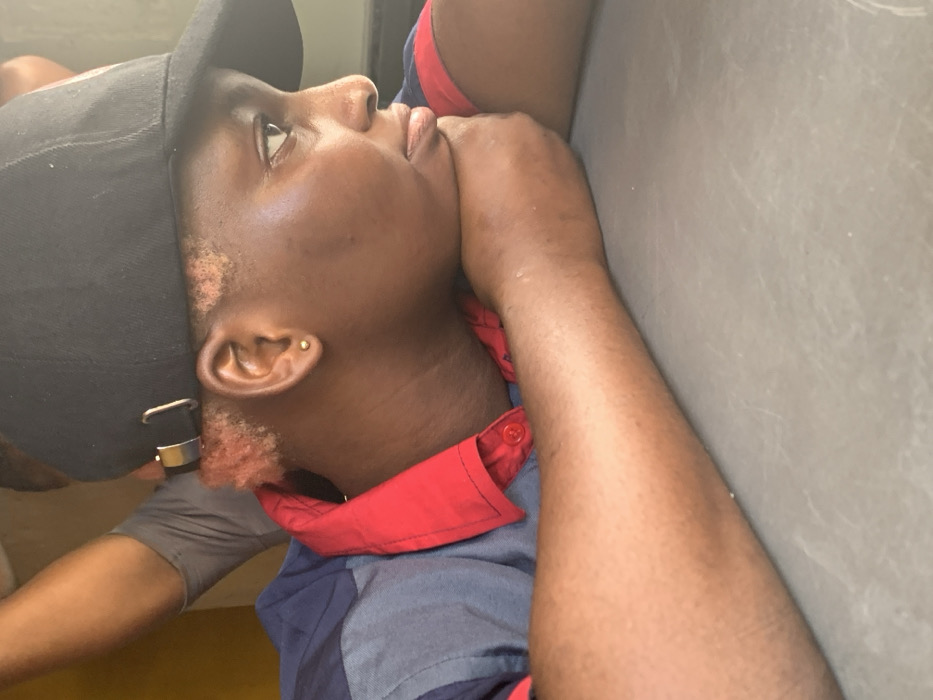 A person with dark skin wears a black baseball cap and a blue and red collared shirt. They are leaning against a gray wall, looking upwards. Their hand is near their mouth. A small gold earring is visible in their ear. The person's hair is tinted pinkish near the ears. The image is rotated counterclockwise.
