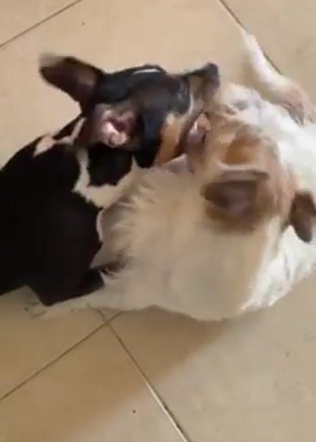 two dogs on a tile floor. One is a small, mostly white dog with some brown markings. The other dog is black with white and brown markings. The dogs are playfully interacting, with the black dog nipping and licking at the white dog, which is lying on its back.