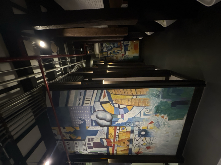 An abstract mural in shades of blue, yellow, and green depicts a cityscape and seascape. The mural is framed by dark wooden beams and pipes, suggesting an architectural or industrial setting. A red pipe runs diagonally across the left side of the image. Above the mural are dark, horizontal beams and a glimpse of another mural in the distance, giving the impression of a corridor or tunnel decorated with art.