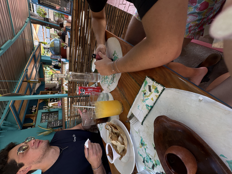 A group dines at a restaurant under a corrugated metal roof. One man wears a black t-shirt and sunglasses. Another pours from a bottle onto a plate. A glass of orange juice and a bowl of tortillas with salsa sit on the table. The table is decorated with patterned mats and a wooden bowl. The restaurant's decor includes hanging wine bottles and a chalkboard menu.