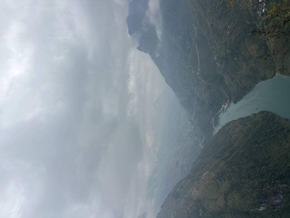 A cloudy sky dominates the frame, contrasting with the green, mountainous terrain below. A sizable lake, a pale turquoise color, stretches out among the mountains. A narrow road snakes its way along the steep slopes of the mountains. The scene appears to be viewed from a high vantage point.