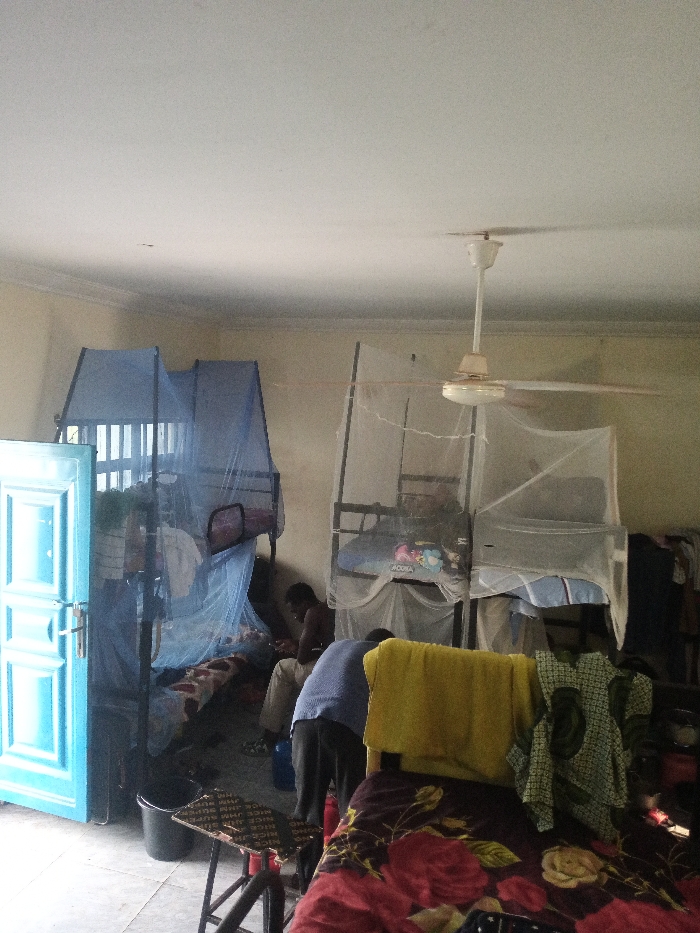 The image displays an interior room in Hayin Banki, Nigeria, functioning as a shared living or dormitory space