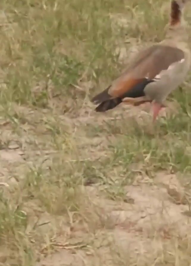- "A bird with a brown head and neck, a gray and tan body, and pink legs walks across a grassy field" by FM-oIWu62, licensed under CC BY 4.0