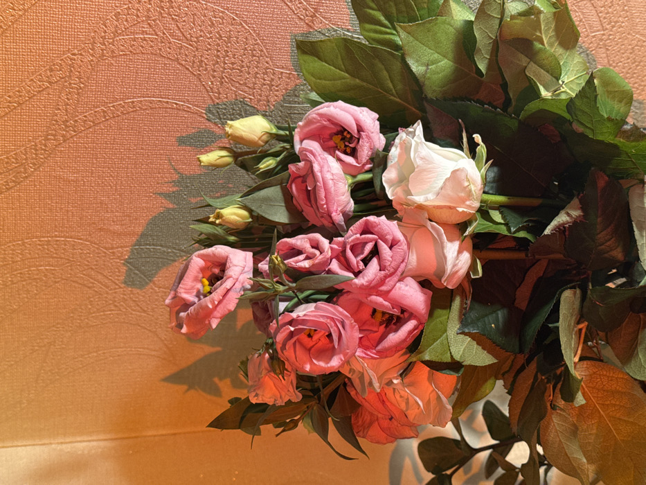 The image presents a close-up view of a floral bouquet. The bouquet consists of numerous pink Eustoma flowers in various stages of bloom, several light pink to white roses, and multiple small yellow flower buds, all interspersed with dark green foliage. A warm light source, originating from the left, illuminates the arrangement and casts distinct, elongated shadows of the flowers and leaves onto the background. The background is a vertical, textured wall with a subtle patterned relief, rendered in a uniform peach-orange hue. No individuals or external objects are present. This indoor scene is situated in the city of Dnipro, Ukraine.