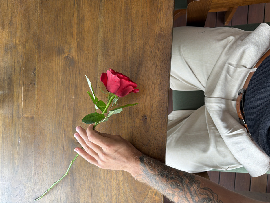 An overhead view captures a person seated at a light brown wooden table in Tibubeneng, Indonesia. A single red rose, displaying green leaves, thorns, and small water droplets on its petals, is held by the individual's left hand. The hand is male, with a visible, intricate dark tattoo covering the forearm. The seated person wears light-colored trousers, a dark blue or black top, and a brown leather belt with a silver buckle. A portion of a green upholstered chair and a dark wooden or tiled floor are visible beneath the table.