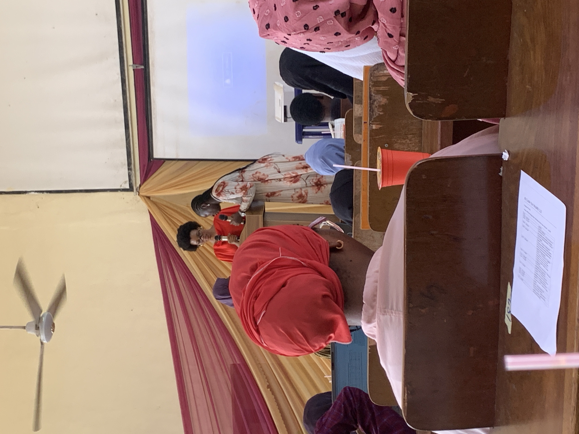 The image depicts an indoor event, likely a seminar or presentation, within a lecture hall or community center located in Ilorin, Nigeria. In the foreground, the back of a seated individual is visible, wearing a red headwrap and a light pink long-sleeved top. A white document with printed text rests on the wooden desk in front of them. To the right, a red cup with a straw is visible on an adjacent wooden desk. Multiple other attendees are partially visible in the audience, primarily women wearing various head coverings, including pink patterned, light blue, and black hijabs/wraps. The wooden desks and benches show signs of wear. At the front of the room, in the midground, two women stand behind a light brown wooden podium. One woman, with dark curly hair and glasses, wears a red top and is holding a microphone, positioned as if speaking. The second woman, with braided hair, wears a long floral-patterned dress and stands to the right of the first, leaning towards the podium. Behind these individuals, maroon and gold-toned fabric drapes are affixed to the wall, serving as a backdrop. In the background, a large white projection screen displays a light blue image with white graphical elements. A white projector unit sits on a blue stand to the right of the podium, oriented towards the screen. The room's upper walls are a light cream color. A three-bladed white ceiling fan is rotating overhead, positioned off-center from the primary subjects.