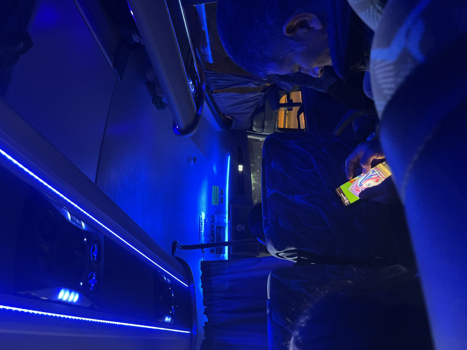 Inside a vehicle, possibly a bus, a passenger is engrossed in their phone under blue LED lighting