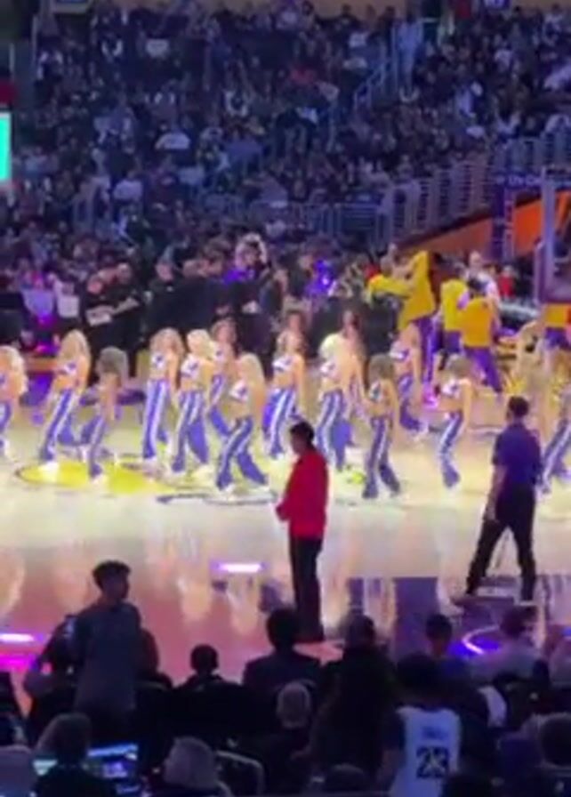 large group of dancers, possibly cheerleaders, performing on a basketball court in front of a large crowd. The dancers are wearing matching blue and gold outfits. There are other people on the court, including what appear to be staff members and a few security personnel. The video is taken from the perspective of someone sitting in the crowd. The environment is a brightly lit indoor stadium. The dancers are performing a synchronized routine.