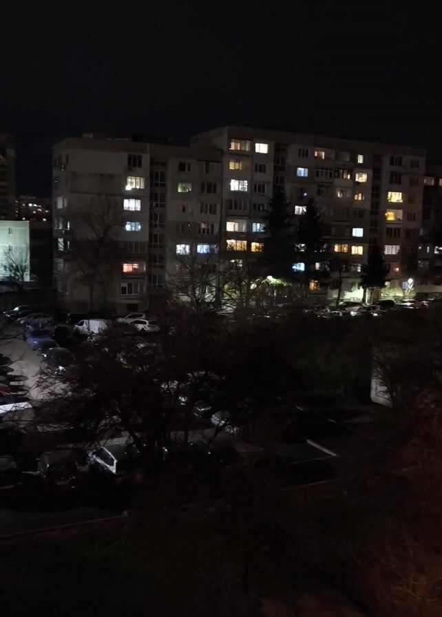 n outdoor night scene. A large apartment building with multiple lit windows is the main focal point. A parking lot with several cars is visible in front of the building, partially obscured by trees. The sky is dark, and the scene is illuminated by streetlights and the light emanating from the building's windows. The camera is stationary, providing a wide shot of the scene. The general atmosphere is quiet and still.
