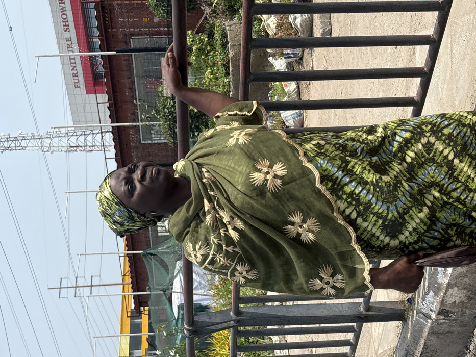 An adult female subject is depicted standing outdoors in Alaguntan, Nigeria, under a clear sky. The subject, with dark skin, wears a green, blue, and black patterned long dress, an olive-green headwrap, and an olive-green shawl adorned with gold embroidered floral patterns. She wears small hoop earrings. Her left hand rests on the top rail of a dark metal barrier, which runs horizontally across the foreground. Her right hand holds a small brown clutch bag. The subject's gaze is directed towards the right side of the frame, slightly upwards, with a neutral facial expression. Behind the barrier, an area with green vegetation and several white sacks is visible on the ground. In the background, an urban environment features a partially visible yellow building with a dark roof to the left. To the center-right, a red and white commercial building displays "FURNITURE SHOWROOM" on its facade. A tall metal lattice communication tower is visible in the distant background, to the right of the building. Overhead, multiple utility lines are strung between utility poles, and several streetlights are present. A concrete curb runs along the base of the metal barrier.