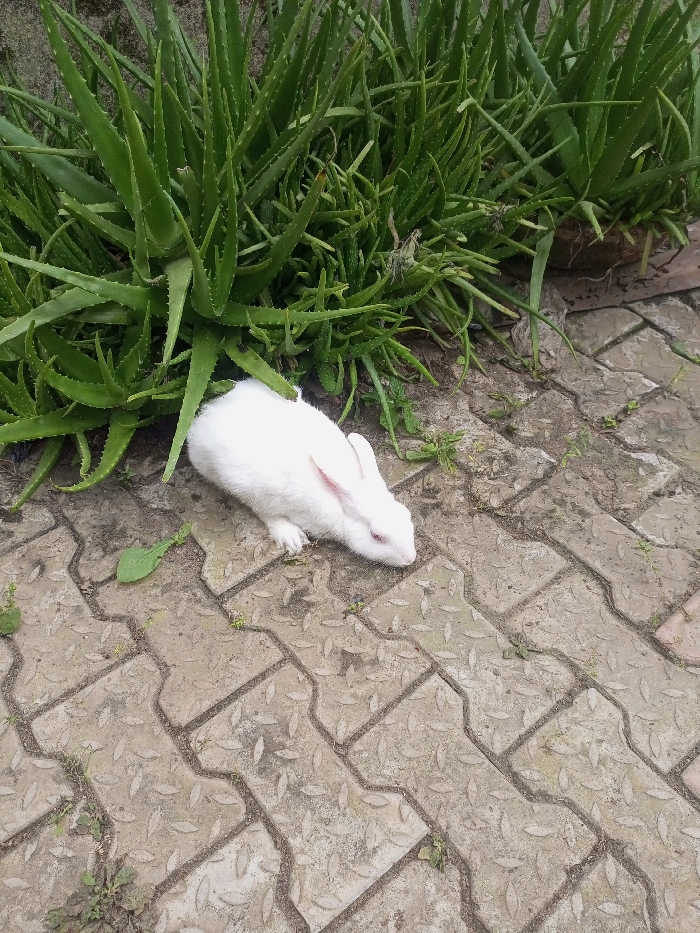 A white rabbit sits on gray, interlocking pavers. A large cluster of aloe plants grows behind the rabbit. The pavers show signs of wear and scattered small plants grow between them. The rabbit has pink ears and appears to be resting or observing its surroundings.