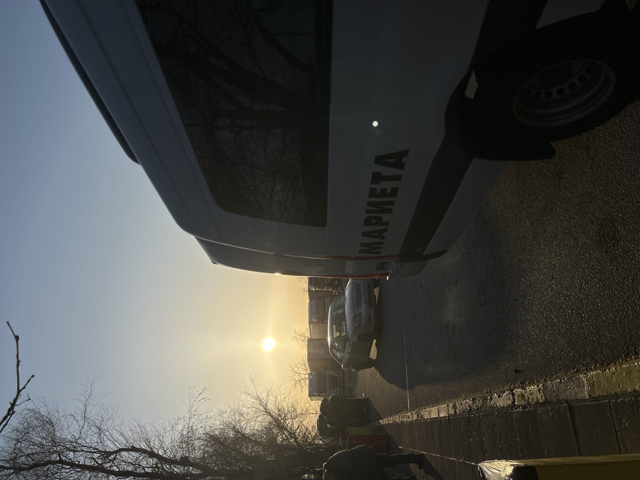 The scene is set in Tsaratsovo, Bulgaria, during either sunrise or sunset, indicated by a low-angle sun appearing as a bright, circular disc in the center-left of the sky, casting long shadows and producing significant lens flare. The sky is clear and light blue, transitioning to a golden hue near the sun. In the immediate foreground on the right, the rear section of a white passenger van or minibus is parked, facing away from the viewer. The Cyrillic word "МАРИЕТА" (MARIETA) is displayed in black lettering on its right rear side. The vehicle features tinted rear windows. To the left, a portion of a person wearing dark clothing is visible on a sidewalk. The sidewalk features a yellow-painted curb and a dark-colored trash receptacle is present near the curb. In the midground, a silver four-door sedan, consistent with a Toyota Avensis model, is parked on an asphalt surface, positioned slightly to the left of the image center and facing away. Its front license plate is partially obscured by glare but visible. The background features a row of multiple parked semi-trailer trucks. Beyond the trucks, several deciduous trees with bare branches are visible against the sky. No direct actions or interactions are discernible between people or objects. The environment appears to be an outdoor parking area or roadside.