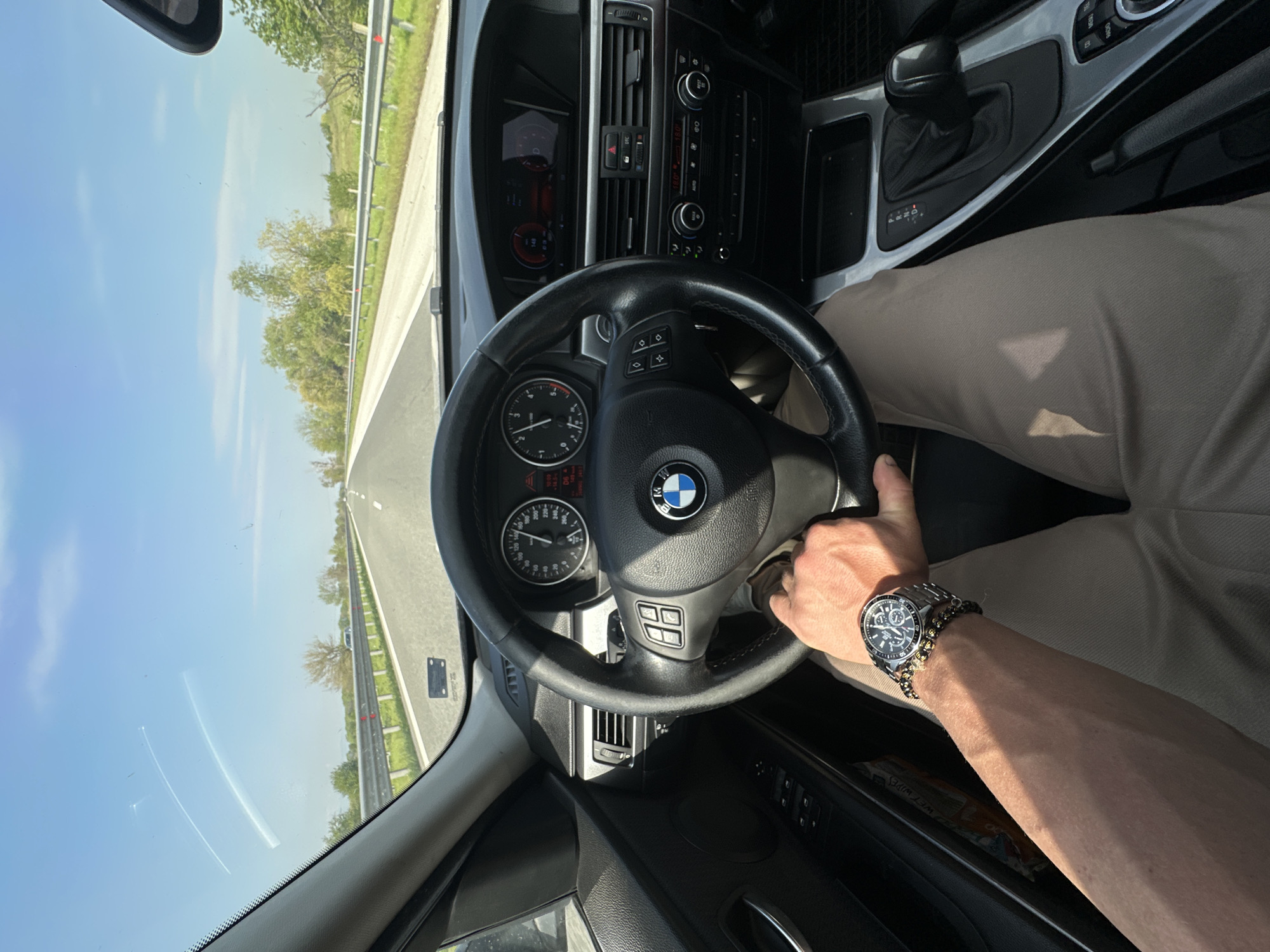 interior of a car, specifically the driver's perspective. The car is a BMW, as indicated by the logo on the steering wheel. The driver's left hand is visible on the steering wheel, wearing a watch and a beaded bracelet. The car is in motion on a road with a guardrail and grassy areas visible outside the windshield. Based on the location information, it could be on a highway near Manole, Bulgaria. The gear shift indicates an automatic transmission. The road appears straight and well-maintained. The sky is light blue with few clouds.