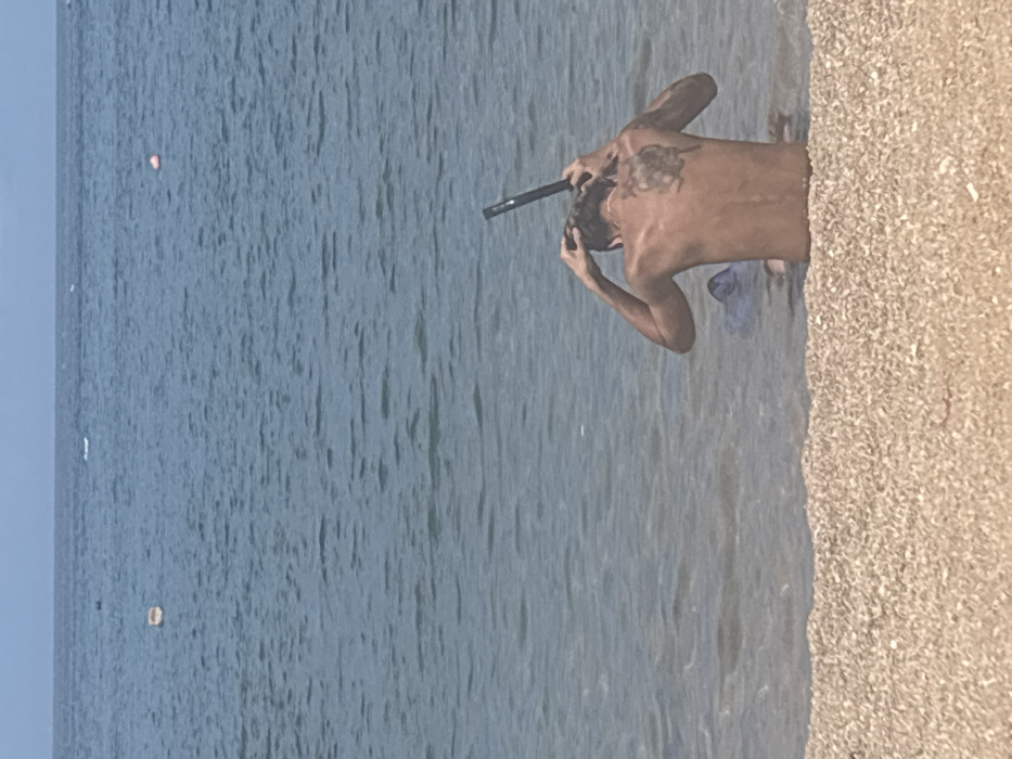 The image displays a coastal scene in ตำบล เกาะเต่า, Thailand. The foreground consists of a light brown, granular beach. Immediately beyond the beach line is clear, shallow ocean water, transitioning to a deeper blue hue in the mid-ground. The horizon line separates the ocean from a pale blue sky. A single individual, observed from behind, is seated in the shallow water, facing towards the open sea. This person is bare-chested, exhibiting a large, dark tattoo on their upper back. Their hands are raised, engaged in the action of adjusting a snorkeling mask over their head. A black snorkel is held vertically in their right hand, positioned behind their head. The individual's lower torso and legs are submerged in the translucent water. In the distant ocean, two small buoys are visible: one light-colored (possibly white or yellow) buoy positioned to the left, and one orange-red buoy positioned to the right. The water surface shows minor ripples.