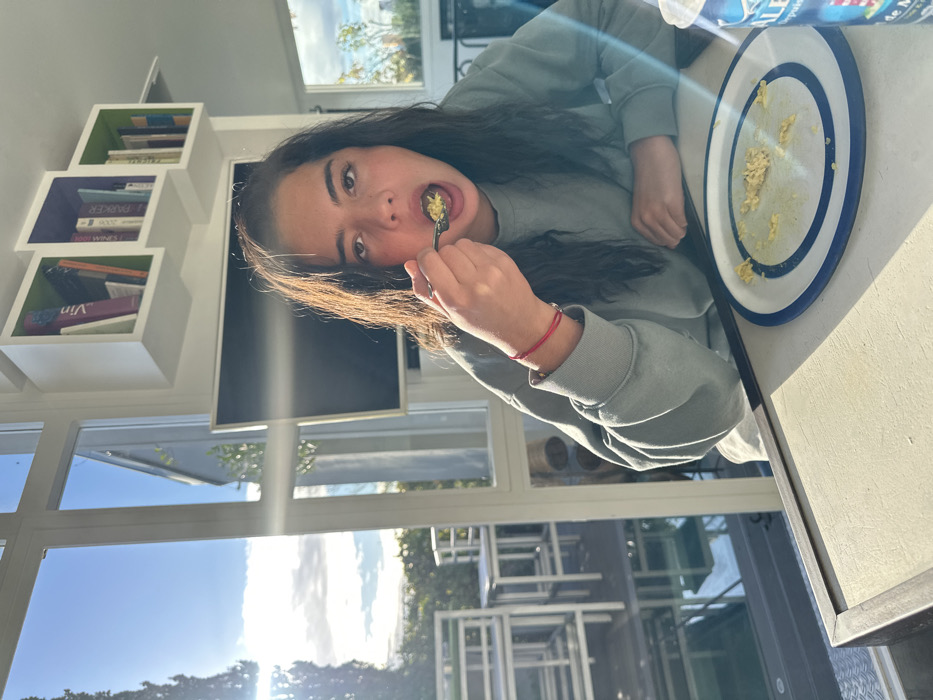 A young female, appearing to be in her late teens or early twenties with long, dark, wavy hair, is seated at a light-colored table indoors. She is actively eating, holding a metal spoon with yellow food (resembling scrambled eggs) to her open mouth, and looking directly at the camera. She wears a light green long-sleeved sweatshirt and a red string bracelet on her left wrist. In front of her, a white plate with blue concentric rings contains residual yellow food. A blue and white can is partially visible to the right. The interior space features large, white-framed windows on the left, through which strong sunlight streams, causing lens flare. In the background, three white, cube-shaped wall shelves with colored interiors (green and purple) hold books. Below these, a dark-screened flat-screen television is mounted. Beyond the windows, an outdoor patio or terrace is visible. It includes stacked white outdoor chairs and a distinct glass floor element, possibly a glass-bottom pool or water feature, reflecting the sky. Tall, slender trees are seen beyond the patio, and a distant cityscape is visible under a partly cloudy, sunny sky. This setting is indicative of a modern residence or hotel in the city of Paris, France, offering an elevated view, though a specific address or neighborhood cannot be determined from the image.