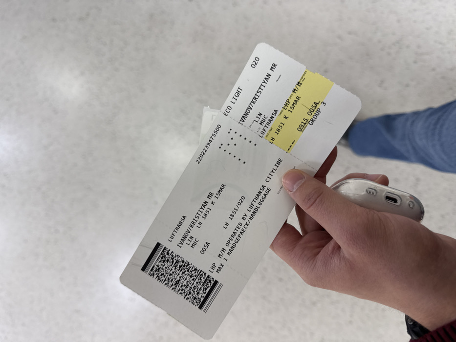 - "A first-person view image captures a person's right hand holding a white Lufthansa boarding pass and a glossy white AirPods charging case in an airport terminal" by FM-nqtPq2, licensed under CC BY 4.0