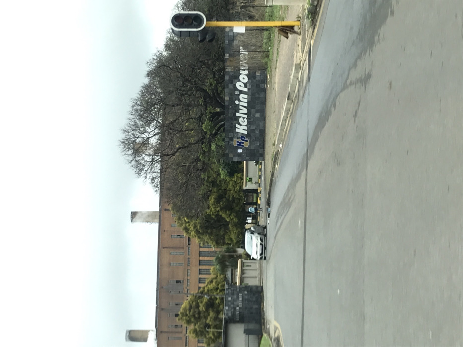 A roadside view features a large "Kelvin Power" sign in dark stone, a traffic light, and a street