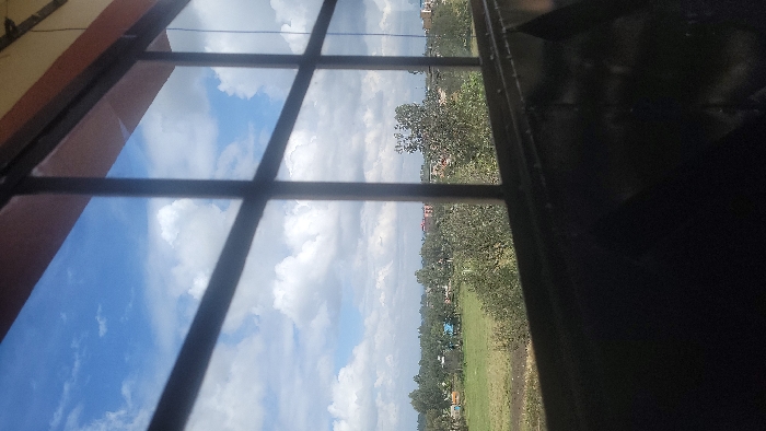 The image displays an exterior landscape captured through a window, framed by dark, multi-pane metal grilles and a dark brown upper window frame. The scene is observed under a partly cloudy sky with prominent white cumulus clouds against a blue background. The midground features an expansive, irregularly shaped field with varying patches of green and dry brown vegetation. This field transitions into a dense band of numerous trees with green foliage. Beyond the tree line, several buildings are visible; these include a light blue-roofed structure to the left and multiple reddish-brown multi-story buildings, consistent with urban development, in the central and right portions of the background. No individuals or active engagements are discernible. The perspective is from an elevated position within the city of Nanyuki, Kenya.
