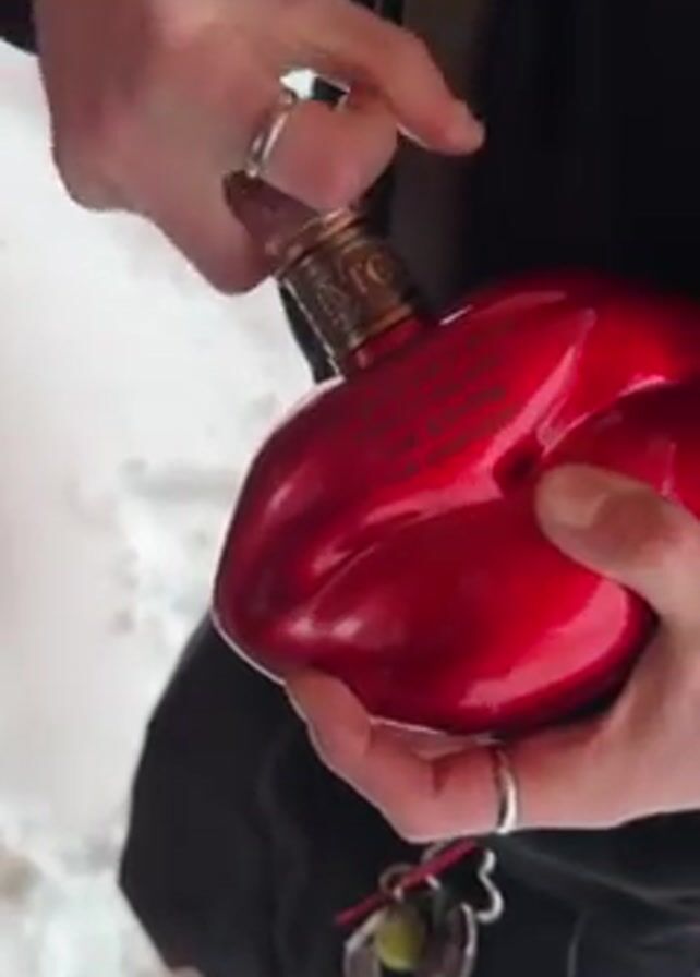 A person is opening a heart-shaped red bottle with a clear stopper outdoors on a snowy surface. The bottle has gold lettering on it. The person is wearing a black jacket and has rings on their fingers. Keys are hanging from their pants. They remove the stopper from the bottle.