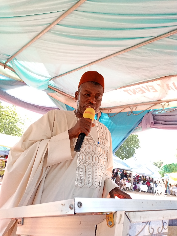 A middle-aged man wearing a white robe and a red hat is speaking into a yellow microphone. He is standing behind a wooden podium with a microphone stand. He is speaking to a crowd of people in the background. The scene is outdoors, possibly at a public event or ceremony. The location is Zum, Nigeria, at the coordinates 10.116 latitude and 13.046 longitude. The background features a blue and white canopy tent, trees, and other attendees at the event.